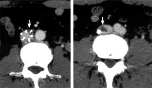 | Fig. 4 Postoperative enhanced computed tomography. →: